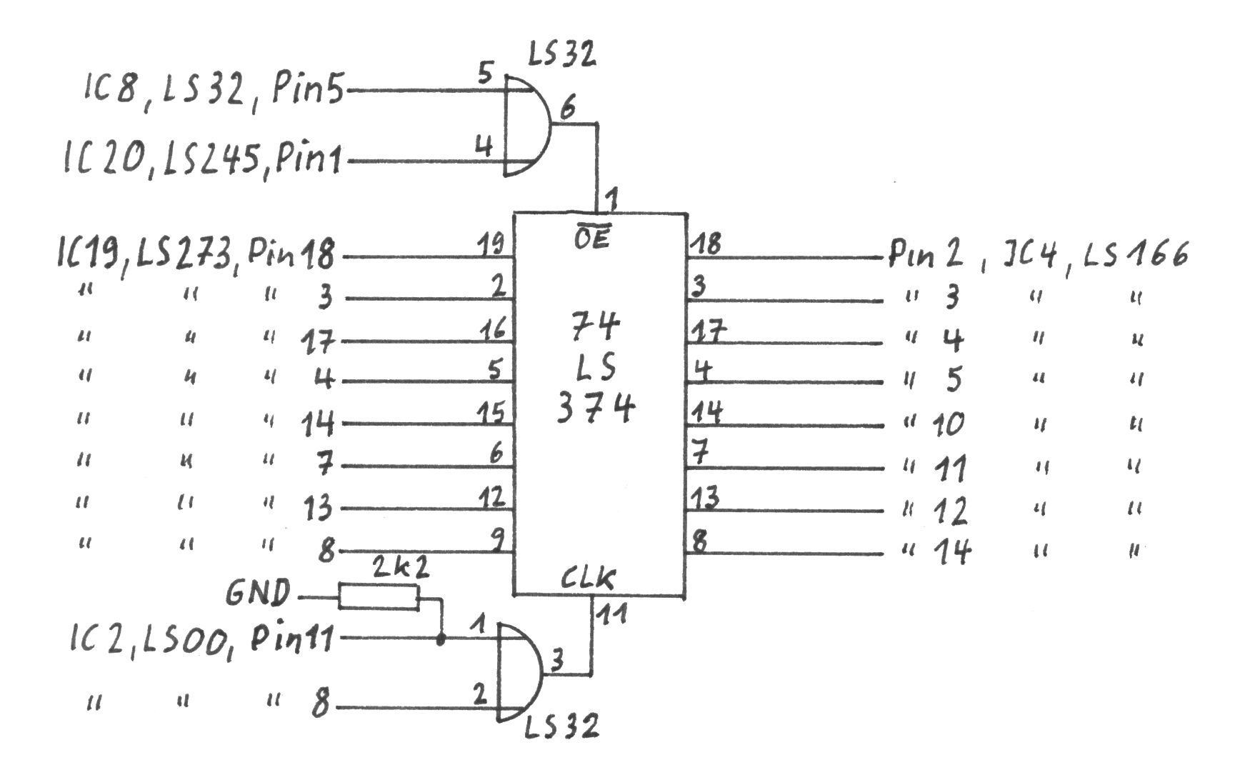 Und was muß gemacht werden?Nicht viel. Bei dem zusätzlichen 74L374 werden außer den Pins 10 und 20 alle Pins um 45 Grad hochgebogen. Dann wird IC 20,74LS245 der GDP64-Karte aus der Fassung gezogen und das 74LS374 mit den Pins 10 und 20 auf den 74LS245 an dessen Pins 10 und 20 angelötet. Dann wird IC 19, 74LS273 aus der Fassung genommen und auf dem Tisch so neben den eben gebauten Doppeldecker gelegt, wie die ICs 19 und 20 nebeneinander auf der Karte gesteckt haben. Mit möglichst kurzen isolierten Drahtstücken werden dann alle in der folgenden Tabelle aufgeführten Verbindungen zwischen Huckepack-LS374 und 74LS273 hergestellt. Beim 74LS273 sollten die Drahtenden möglichst weit oben am Pin angelötet werden, damit die Pins nachher auch wieder in die Fassung passen. Danach kann das Verbundsystem wieder in die Fassungen gesteckt werden. Nun werden die Verbindungen des Doppeldecker-74L374 mit den Pins des 74LS166 entsprechend der rechten Hälfte der Tabelle hergestellt, wobei dann der 74LS166 aus der Fassung zu ziehen und locker auf diese zu stellen ist (damit sich die Drahtlängen richtig bemessen lassen und andererseits beim Anlöten keine dauerhafte Verbindung zwischen IC und Fassung hergestellt wird; das entspräche dann auch nicht mehr dem Sinn einer Fassung). Verbindungen zwischen dem Huckepack-LS374 und IC 19 sowie IC 4Signal IC19, Huckepack IC4, LS273 LS374 LS166 Pin Pin Pin Pin