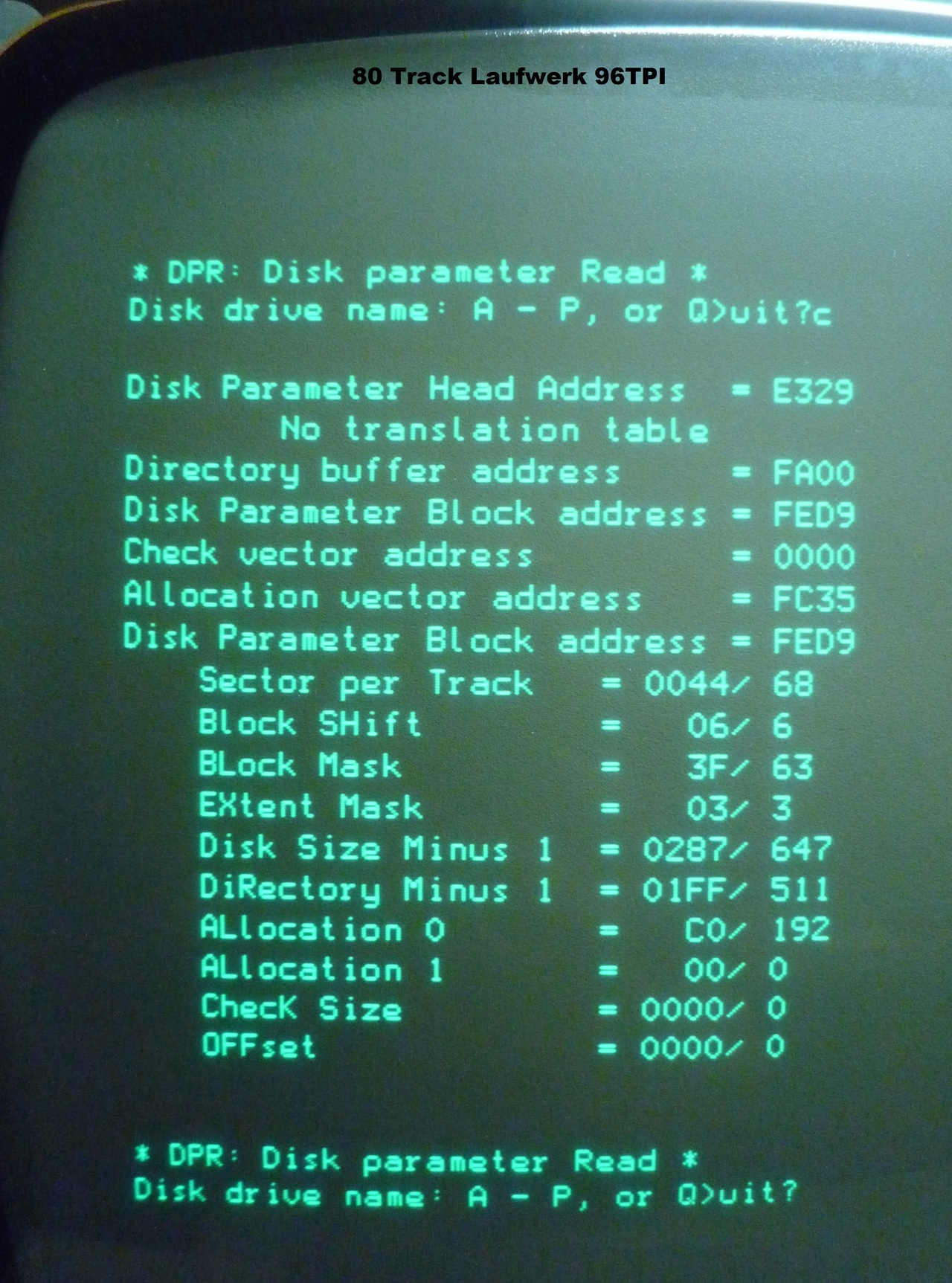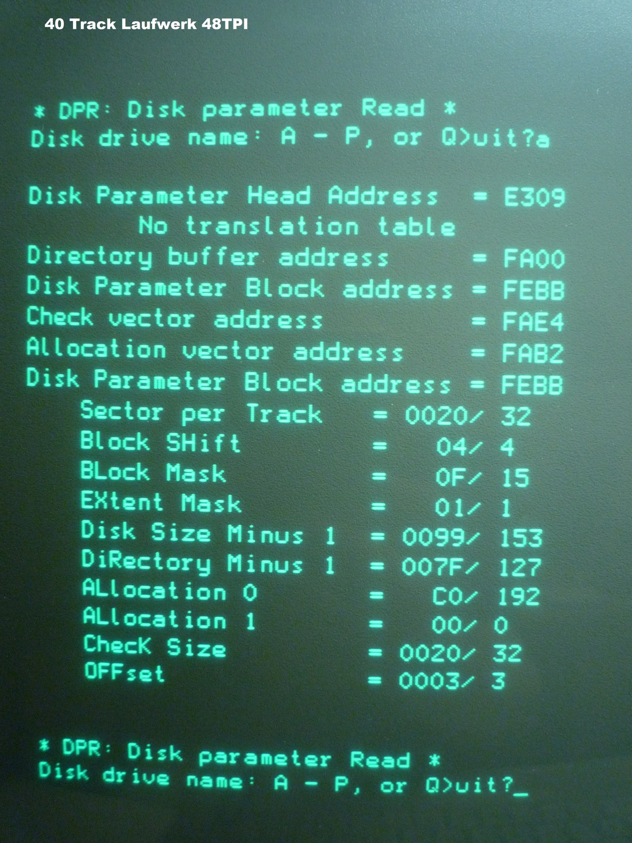 The DMV was even sold with double sided 80 track drives. Here with CP/M80 the DPB like STAT A: DSK: I have a switchable 40/80 track drive for drive A in one DMV